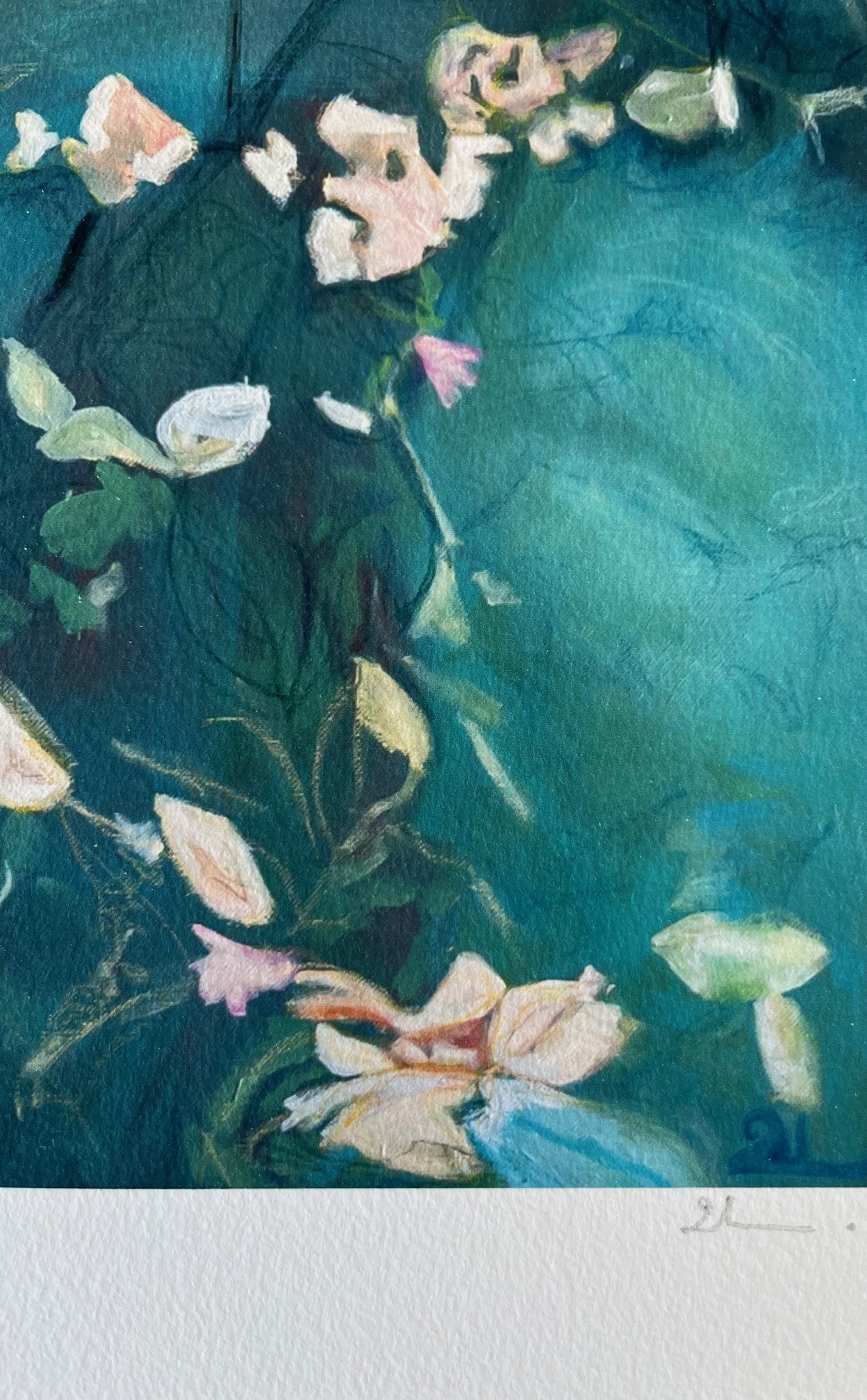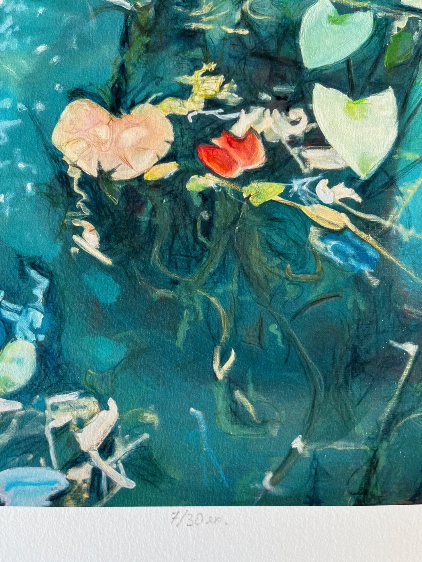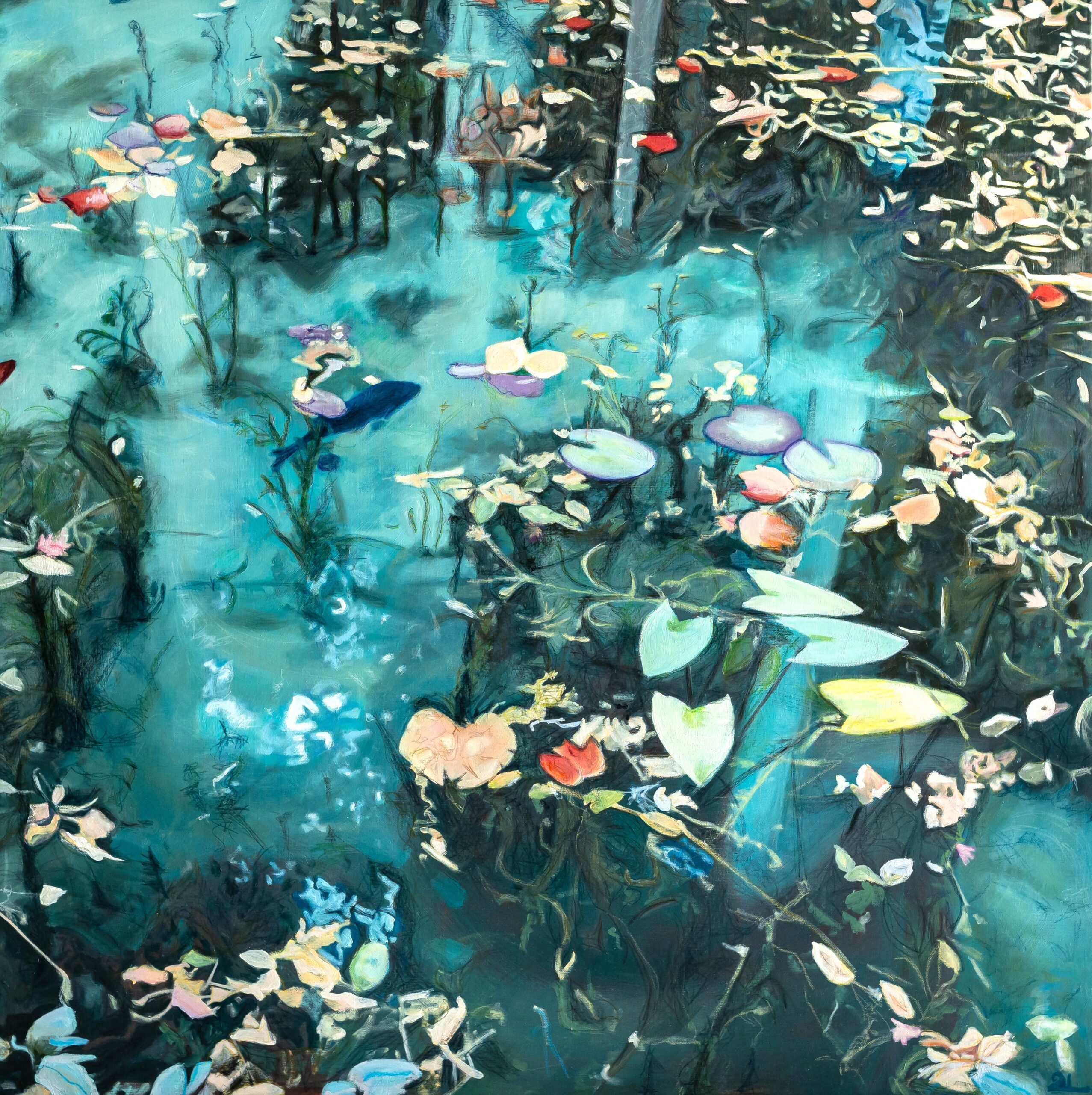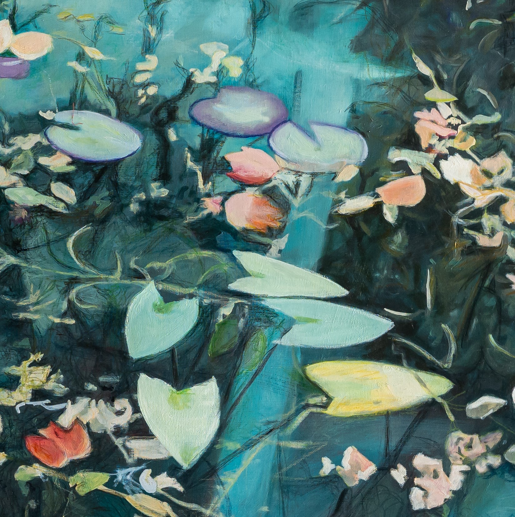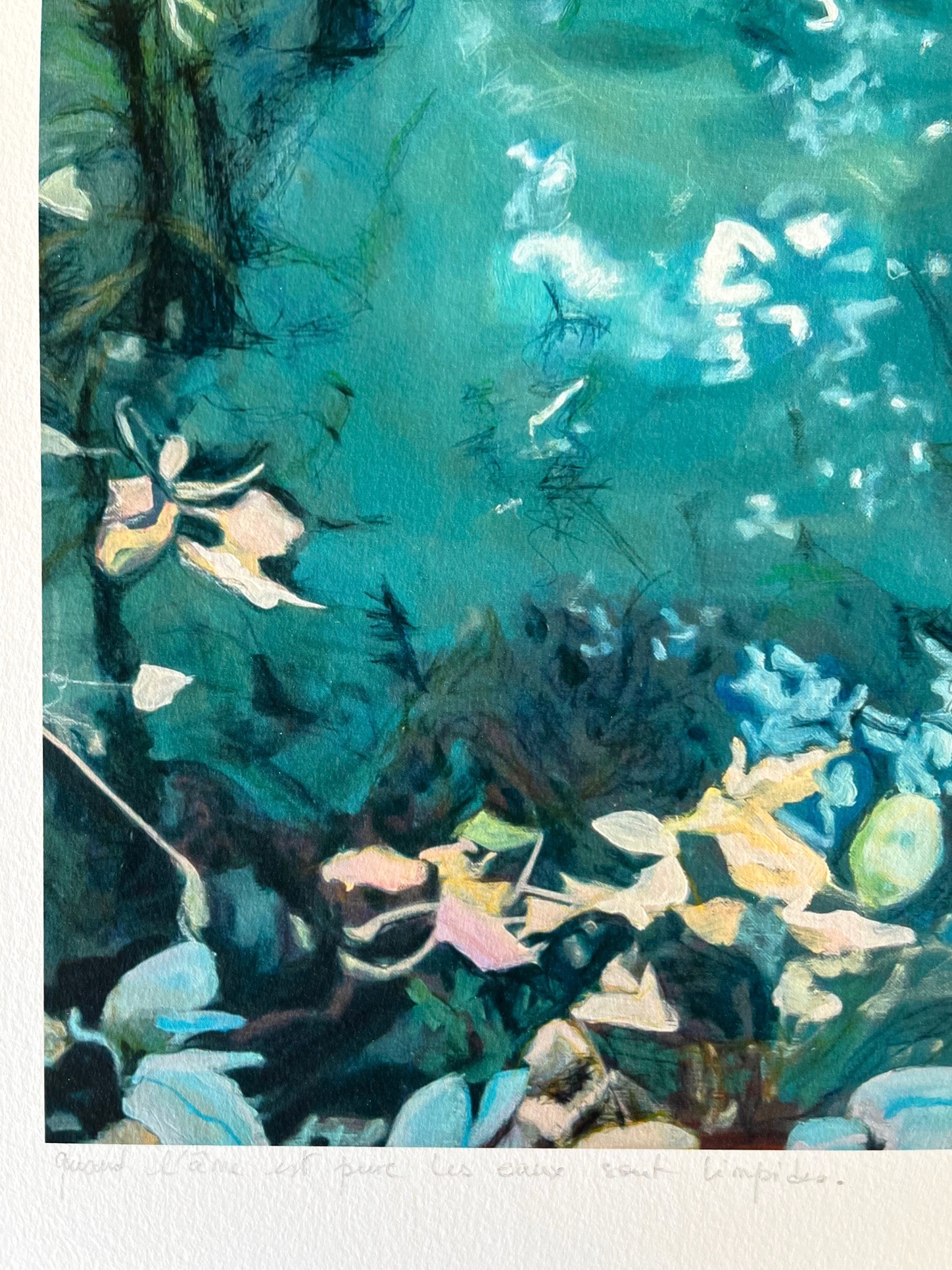 Quand l’âme est pure les eaux sont limpides est une invitation au ressourcement, à la sérénité. C’est une oeuvre contemplative, presque méditative, où la nature aquatique devient métaphore de l’intériorité. La couleur des nénuphars , roses fanés, jaunes pâles et blancs nacrés apportent des touches de douceur. Telles des pensées s’estompant peu à peu, elles permettent à la lumière de venir éclairer les eaux plus profondes.
